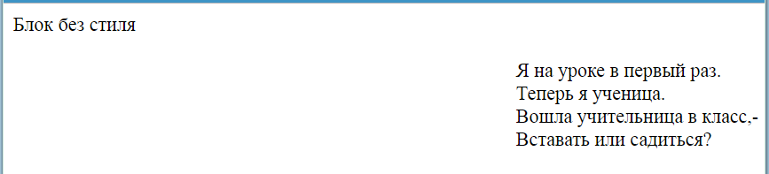 <style><head> <body> <p> Я на уроке в первый раз.<br> Теперь я ученица.<br> Вошла учительница в класс,-<br> Вставать или садиться?<br> <p> <div>Блок без стиля<div> |