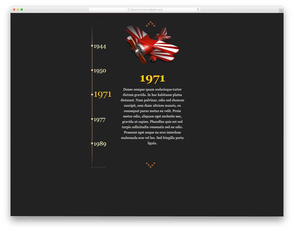 Narrow Vertical Timeline is another version of the Responsive Slider Timeline With Swiper design mentioned above. But, this one uses less screen space when compared to the Responsive Slider Timeline With Swiper. In this design along with the text space, you also have space to add icons and images. If you like to give a narrative experience to your users, this design will help you. Arrow keys for navigations are given at the top and the bottom. Subtle animation effects are used for the arrow keys. For more attractive arrow key designs and animations take a look at our CSS arrow design collection.