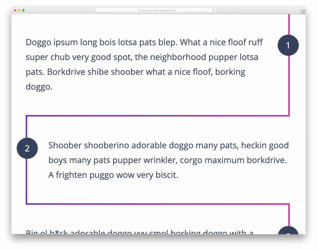 This one is a simple and easy-to-implement timeline design. The creator has used the timeline itself as a border to separate the sections. Cleverly used gradient colors, improve the visual aesthetic of the design. The code script of this design is kept simple, just like the design. If you like to liven up the design, you can add a color-shifting effect to the gradient timeline design. For more innovative hover effects, take a look at our CSS hover effects collection. The entire code script is shared with you on the CodePen editor. You can play with the code and can visualize it on the editor itself.