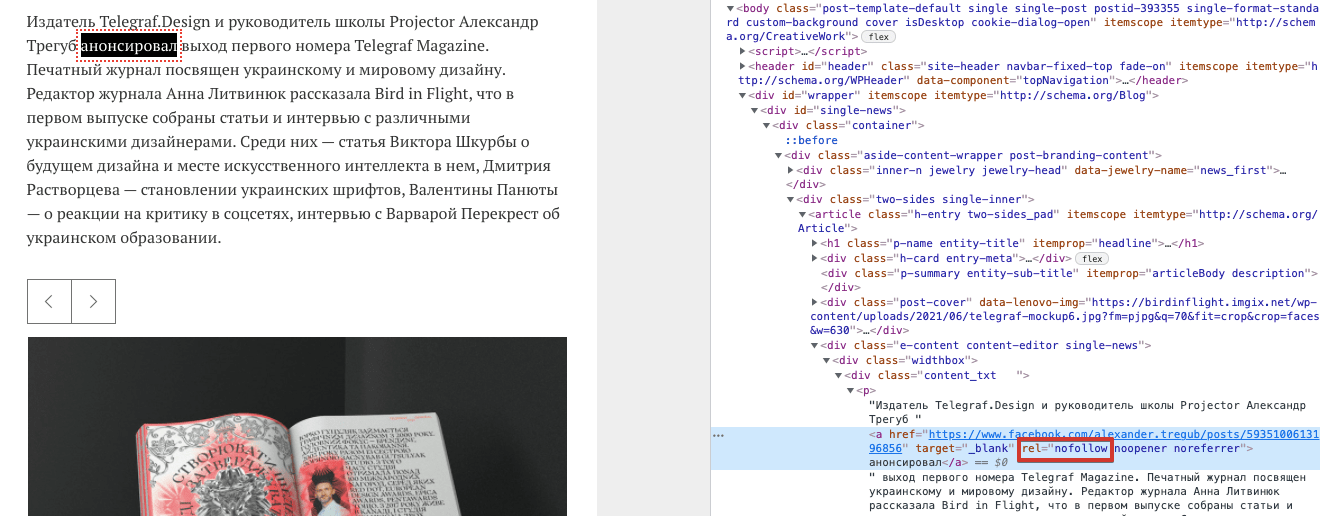 Иногда может возникать необходимость понять, как гиперссылки вставляются на сайт сторонним веб-мастером. Обычно это требуется тогда, когда чужой сайт рассматривается в качестве площадки-донора для размещения бэклинка. Чтобы определить, используется ли атрибут rel=»nofollow», нужно просто провести несколько манипуляций в браузере. Опишем процедуру на примере Google Chrome, но в других браузерах процесс несильно отличается.