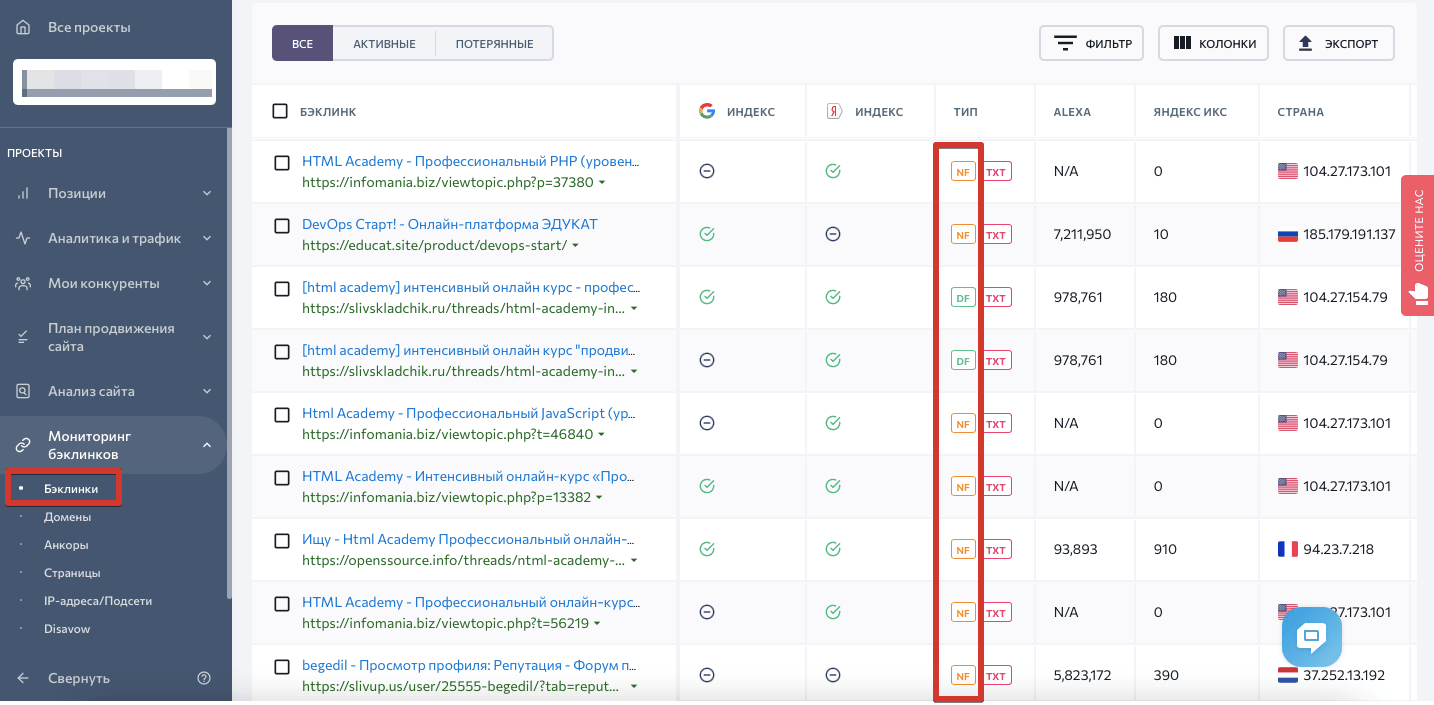 В подразделе «Бэклинки» вы увидите таблицу обратных ссылок с их характеристиками. Колонка «Тип» указывает на то, где размещена ссылка (в тексте или изображении), а также ее статус (dofollow/nofollow):
