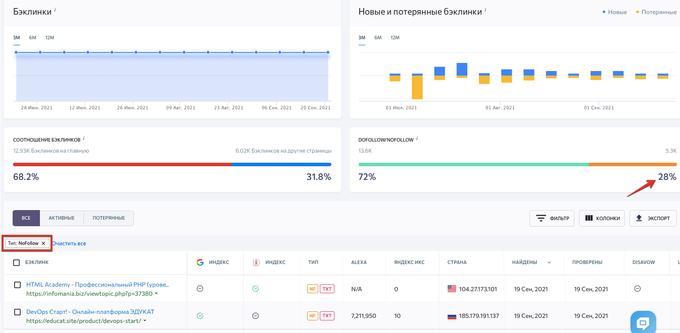 Вы также можете проанализировать соотношение dofollow- и nofollow-ссылок на графике «Новые и потерянные бэклинки» и фильтровать таблицу по этому показателю: