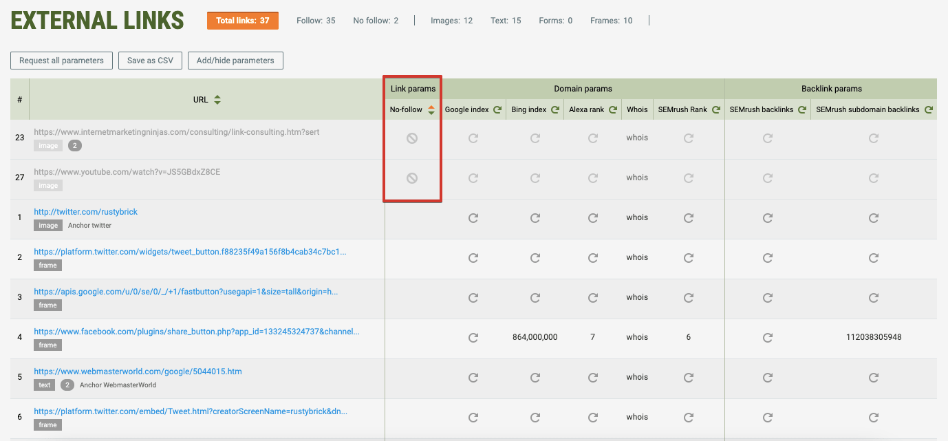 - Проверяется наличие rel=»nofollow» в коде ссылки.