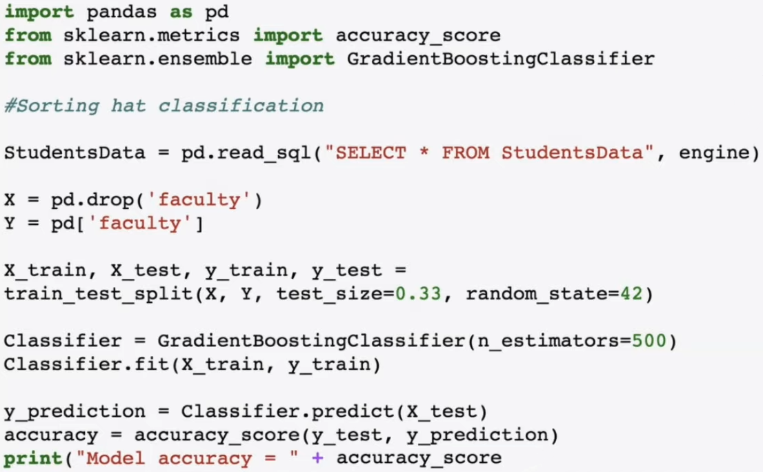 Это имитация шляпы из «Гарри Поттера», которая распределяет студентов по факультетам. Наша шляпа учится сама. Она читает данные о студентах из прошлых лет и делит их на две группы: данные о самих студентах и о том, на каком факультете они учатся. Потом шляпа учится предсказаниям с помощью модуля машинного обучения и проверяет свои способности на контрольной группе. В конце программа оценивает точность предсказания.