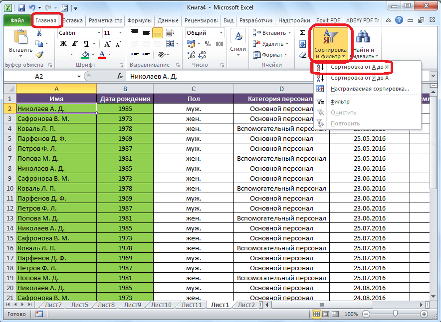 - Выберите инструмент: «Главная»-«Редактирование»-«Сортировка и фильтр»-«Сортировка от А до Я».