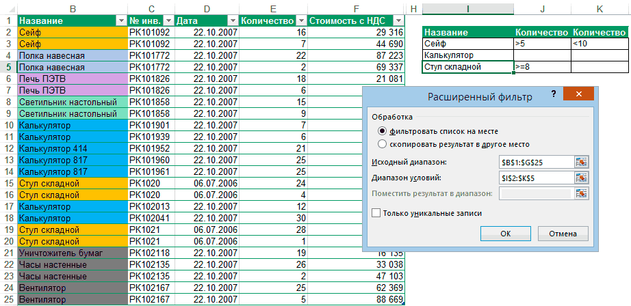 Расширенный фильтр предоставляет дополнительные возможности. Он позволяет объединить несколько условий, расположить результат в другой части листа или на другом листе и др.