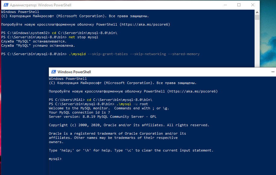 Если ваш клиент разрывает соединение после выполнения каждой команды, например, Query Browser, то после выполнения flush privileges; он будет требовать указать пароль, который мы ещё не успели назначить. Назначить сначала пароль с помощью команд grant или set password не получится, так как в режиме skip-grant-tables их нельзя использовать. (Выше уже указывалось, что flush privileges; отменяет данный режим, поэтому в предыдущем пункте данные команды работают.) Остается единственно возможный способ это напрямую изменять данные в таблице mysql.user