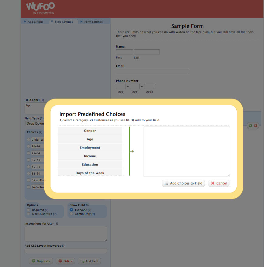 - Предопределенные варианты. Если вы собираете конкретную информацию от посетителей сайта (для исследовательского проекта или в рамках опроса), вы с легкостью можете предварительно заполнить общие демографические параметры для полей множественного выбора. Добавьте пол, возраст, занятость, доход и варианты образования всего за пару кликов.