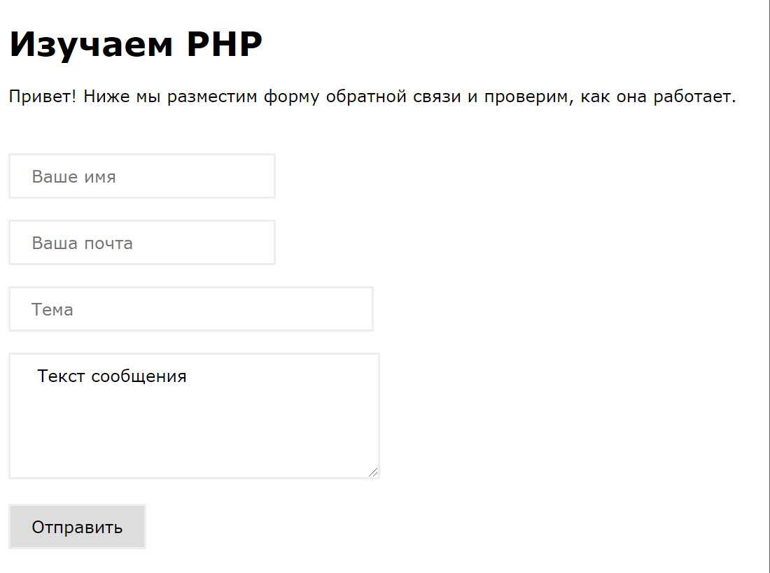 Ещё мы воспользуемся тегом — он мысленно собирает наши поля в одну форму и помогает управлять ими из одного места. У каждой формы есть свой метод, по которому она работает с данными. Форма может или отправлять данные (post), или получать их (get). Так как нам надо отправить сообщение в PHP-скрипт, будем использовать метод post. Сразу пропишем путь к скрипту на сервере — по этому адресу мы зальём нужный файл на следующем этапе. Этот скрипт, который мы позже напишем, и есть обработчик формы.