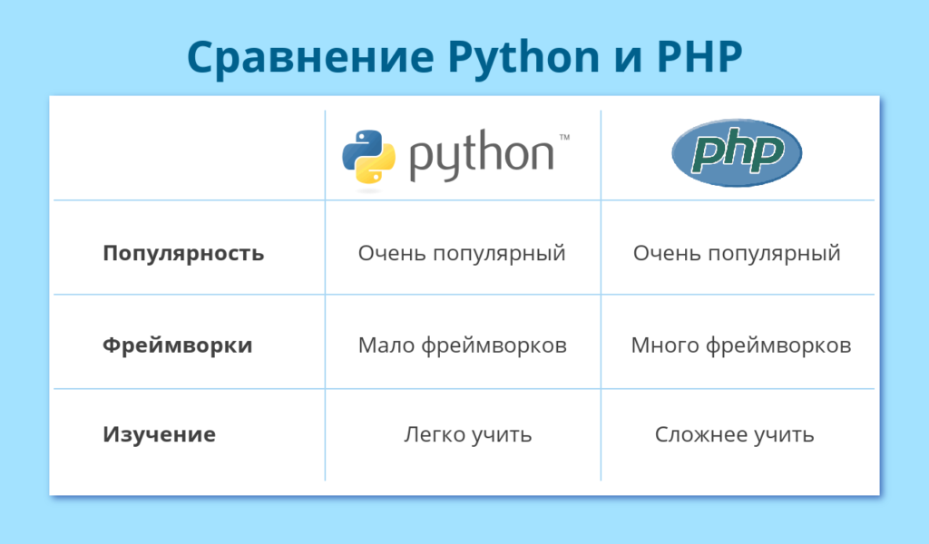 - Изучение. Если вы хотите изучить какой-то язык программирования, стоит узнать, насколько простым или сложным он считается. Здесь Python определенно является победителем — его синтаксис проще и легче, чем у PHP. Но PHP был создан специально для веб-разработки, поэтому в этой сфере часто выбирают именно его, несмотря на то, что он сложнее.