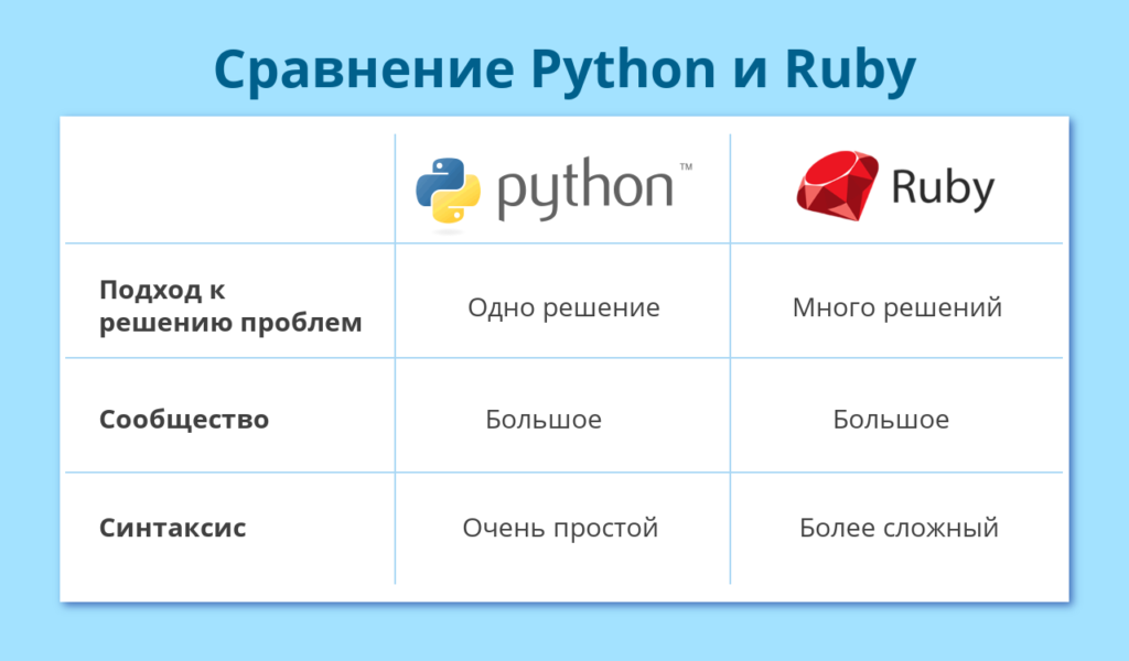Самый распространенный фреймворк Ruby это Ruby-on-Rails. Он довольно похож на Django — фреймворк Python. Обе эти технологии имеют многочисленные сообщества.