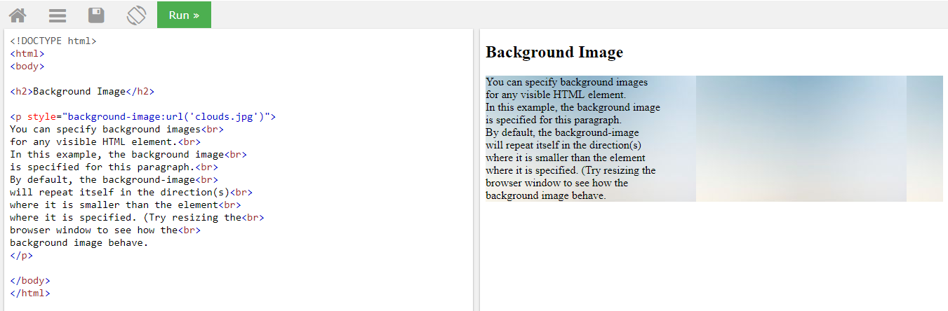 <body> <pstyle=»background-image:url(‘clouds.jpg’)»> … </p> </body> |