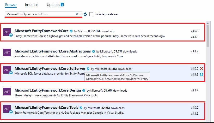 Let’s create a database for this application using Entity Framework Core. For that we’ve to install corresponding NuGet Packages. Right click on project from solution explorer, select Manage NuGet Packages, From browse tab, install following 3 packages.