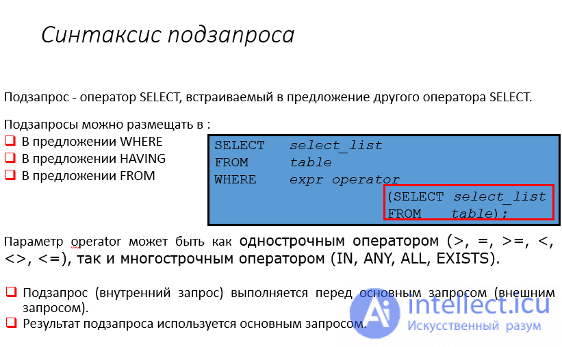 Вложенный во внешнюю инструкцию SELECT запрос, имеет следующие компоненты: