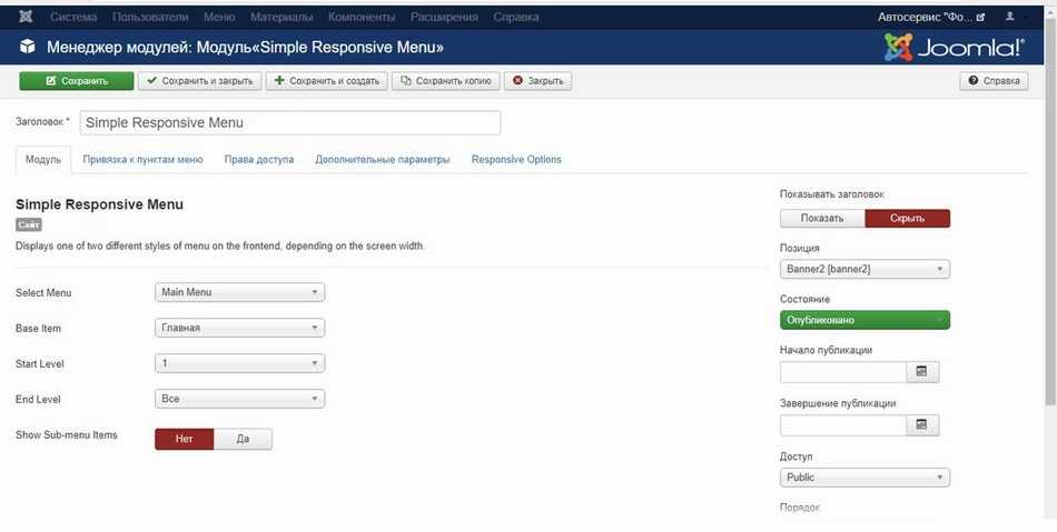 Ссылка для скачивания актуальной последней версии: https://extensions.joomla.org/extensions/extension/structure-a-navigation/menu-systems/simple-responsive-menu. Выбираем источник, например, mainmenu или создадим новое, специально под Simple Responsive Menu. Зададим пункт, который будет по умолчанию активным. Настроим уровни вложенности: по умолчанию с 1-го до последнего.