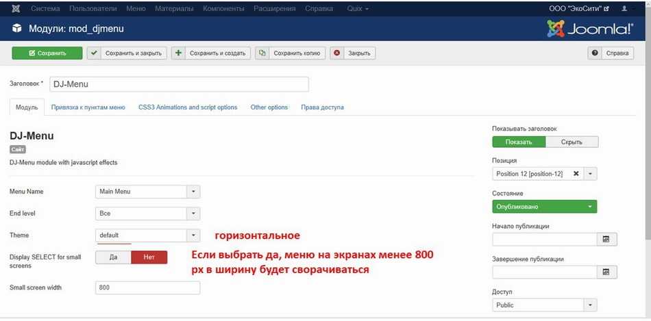 - тему (по умолчанию – стильное меню для joomla3, в тёмных тонах, горизонтальной ориентации с выпадающим списком; если выбрать иной вариант – оформление будет зависеть от шаблона);