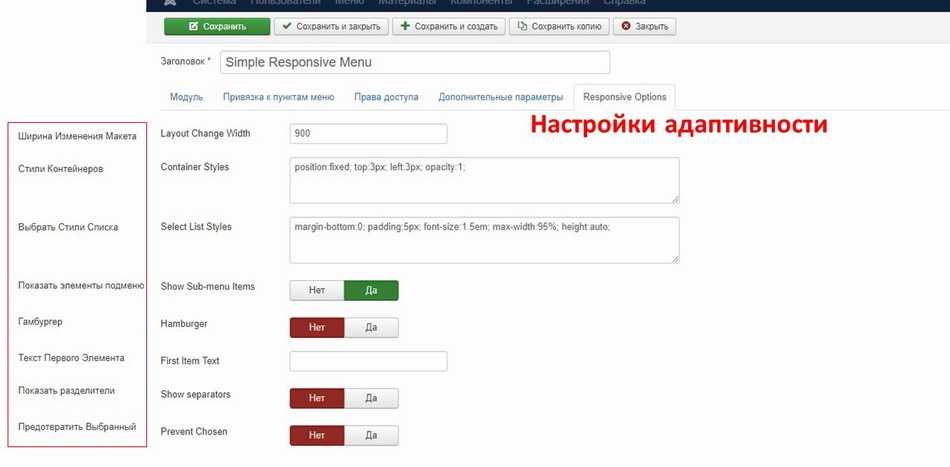 Перейдём в последнюю вкладку, где зададим параметры адаптивности: