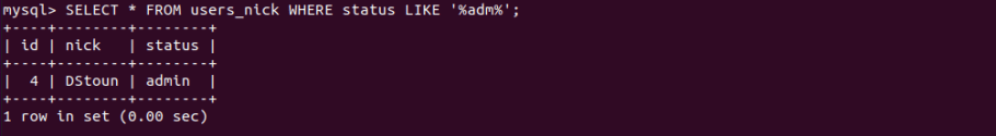 В этом запросе мы попросили железяку показать нам записи в таблице users_nick в которых, в столбце status присвоено значение user. При этом не забывай что в условии WHERE можно использовать логические операторы (AND/OR) и математические операторы сравнения (=, <, >, <=, >=, <>). Ну и не менее полезная штука, это поиск по шаблону. Потому что мы не всегда знаем какая точно запись нам нужна, для этого используется команда LIKE: