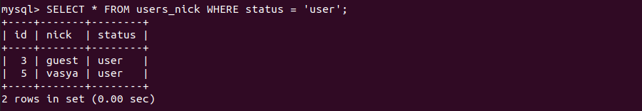 мы получим все уникальные значения из столбца status таблицы users_nick.