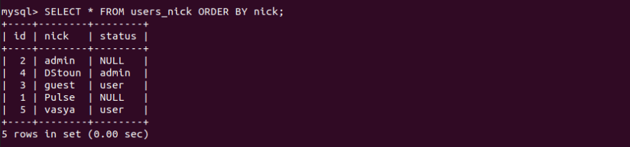 Здесь мы попросили отсортировать данные таблицы по столбцу nick. И в результате получили список пользователей в алфавитном порядке. Но это не единственны способ. Можно, например, отсортировать данные не в алфавитном порядке (по возрастанию — если цифровые), но и в обратном порядке (по убыванию — если цифровые). Для этого к названию столбца по которому фильтруем нужно дописать DESC.