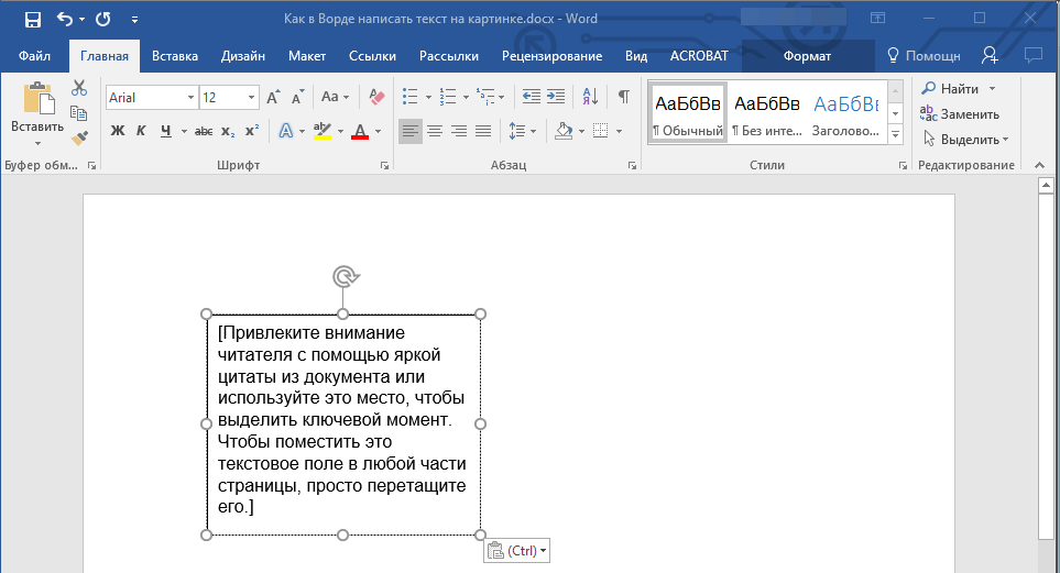 5. Переместите текстовое поле на картинку, если это необходимо, выровняйте положение объектов, воспользовавшись инструментами в группе “Абзац” (вкладка “Главная”).