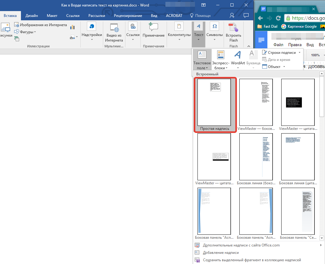 1. Откройте вкладку “Вставка” и в разделе “Текстовое поле” выберите пункт “Простая надпись”.