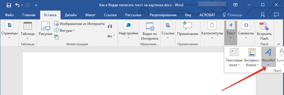 1. Откройте вкладку “Вставка” и в группе “Текст” нажмите на пункт “WordArt”.