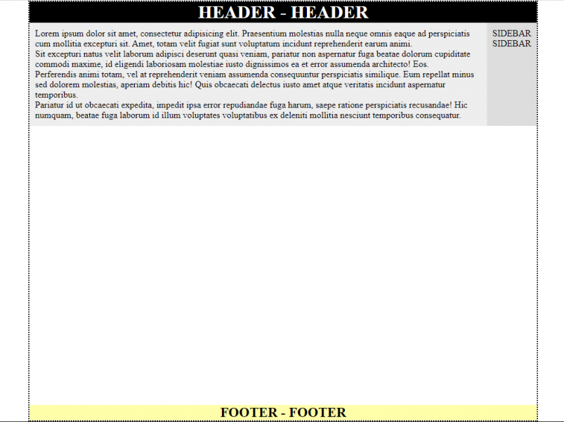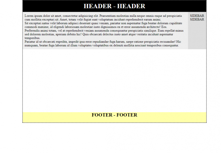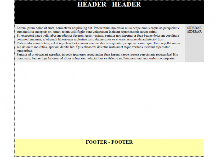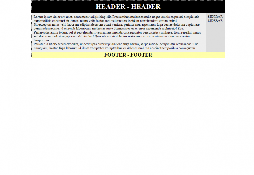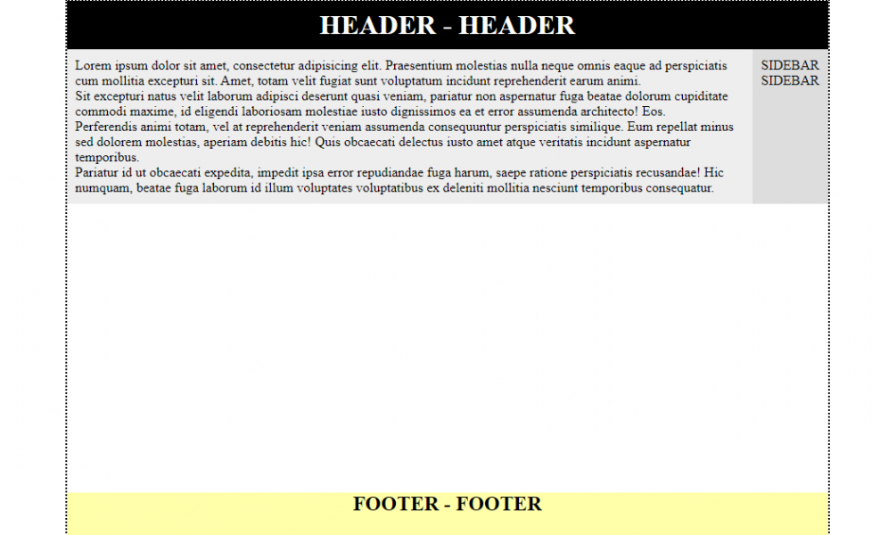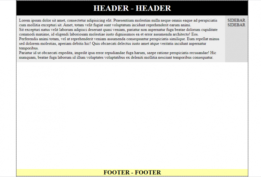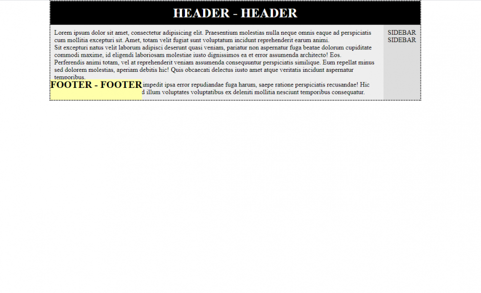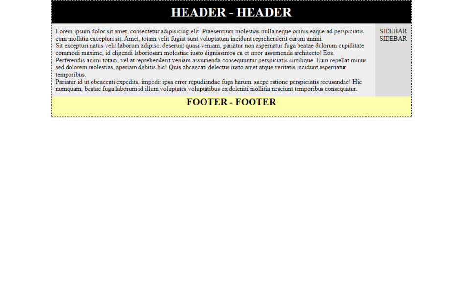 Пока что это простое украшательство, мы добавили обертке штриховую рамку и раскрасили основные блоки — header, main , aside и footer, чтобы проще их различать. Текущий результат не очень впечатляет, правда?)