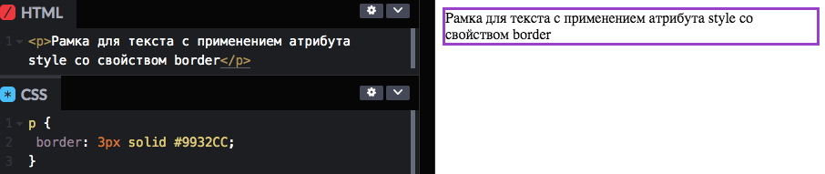 <!-- HTML --> <p>Рамка для текста с применением атрибута style со свойством border</p>