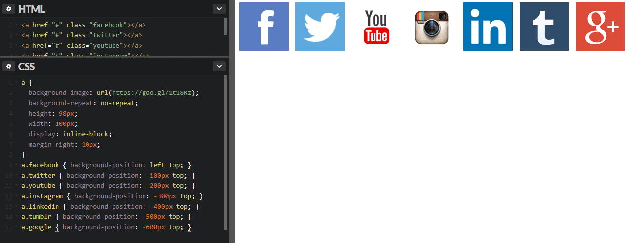 Теперь пора узнать, как использовать CSS-спрайты на практике. Мы покажем вам небольшой пример с использованием спрайта, содержащего значки социальных сетей (мы показывали его выше). В обычном состоянии ссылки значок соцсети будет цветным (верхний ряд спрайта), а при наведении курсора он будет становиться серым (как в нижнем ряду).
