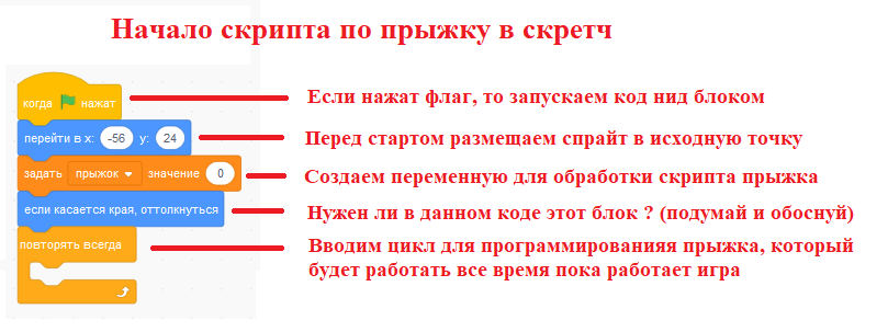 Скрипт описывает последовательность действий после нажатия на Флаг. Всегда делайте начальное позиционирование объекта, чтобы условия запуска игры были одинаковы и не всплыло дополнительных программных глюков. Делайте это не только для главного персонажа, а для всех объектов! Далее вводим переменную, в которой будут храниться и изменяться данные по координатам прыжка персонажа. Ну и конечно же запускаем цикл постоянной работы. В цикл запишем условия для позиционирования спрайта (черный квадрат) в рабочем пространстве.