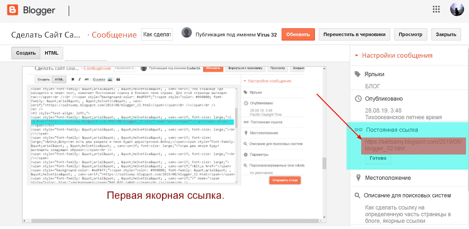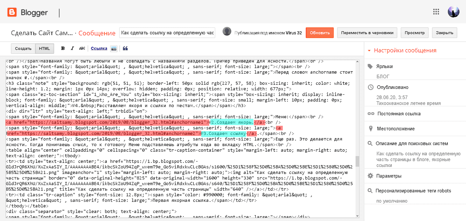 Пример посмотрим для меню.Допустим есть два раздела и меню будет двухстрочное.Тогда два якоря будут выглядеть следующим образом:<a href=»https://saitsamy.blogspot.com/2019/08/blogger_32.html» name=»anchorname1″></a><a href=»https://saitsamy.blogspot.com/2019/08/blogger_32.html» name=»anchorname2″></a>Красным цветом выделена постоянная ссылка сообщения, которую скопировали с панели в боковом меню.Синим цветом выделено индивидуальное имя якоря.Якоря с одинаковыми именами не приемлемы и как видно в первом случае это: «anchorname1», во втором «anchorname2». Различие в цифре. Якорей делают сколько необходимо. Лимита нет.