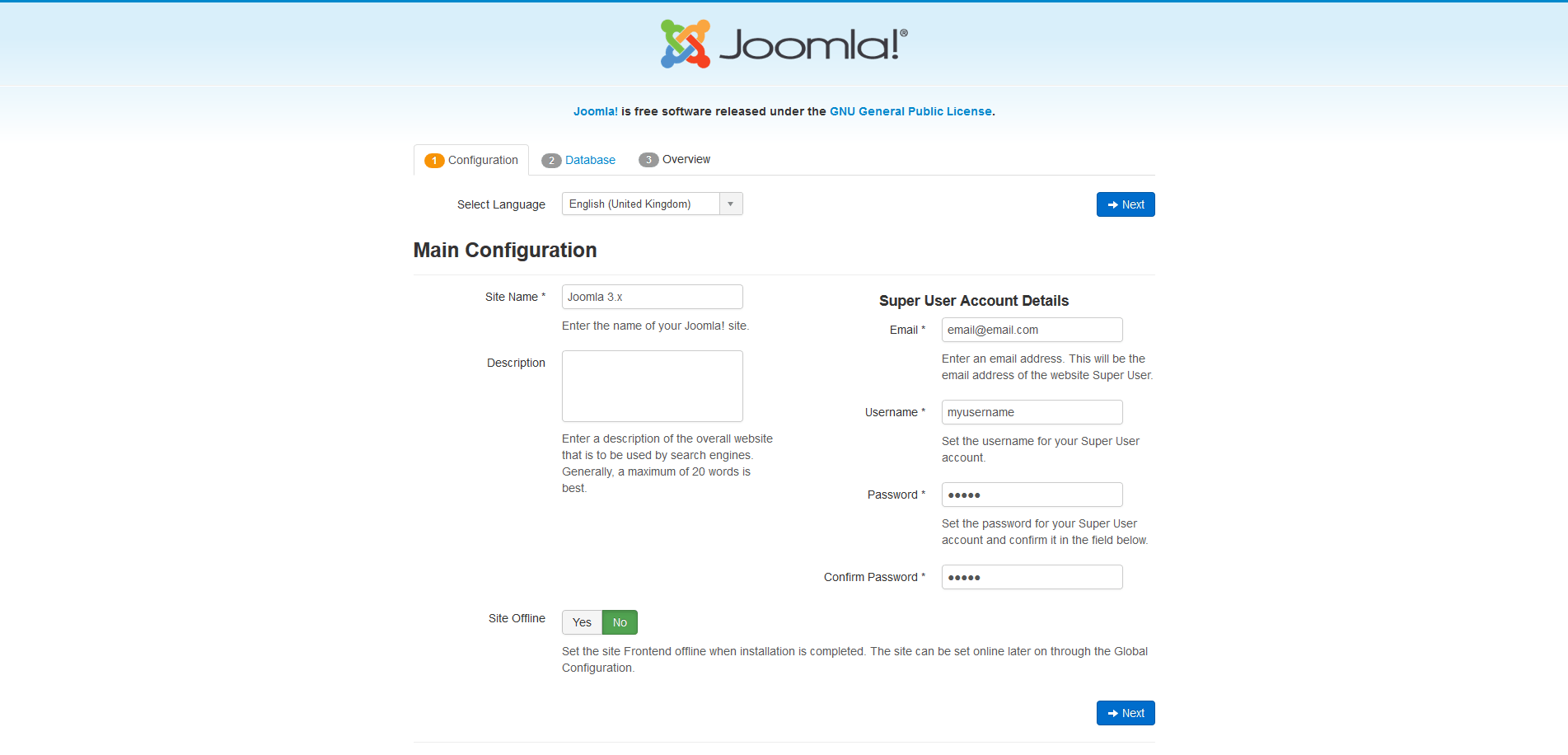 Когда выше приведенные требования удовлетоворены, создана какая-либо база данных и необходимые файлы находятся на месте, — Вы готовы к установке Joomla!. Запустите веб-установщик Joomla! открыв свой браузер и доменное имя Вашего веб-сайта. На установке на хосте Вы будете использовать http://www.yoursitename.com