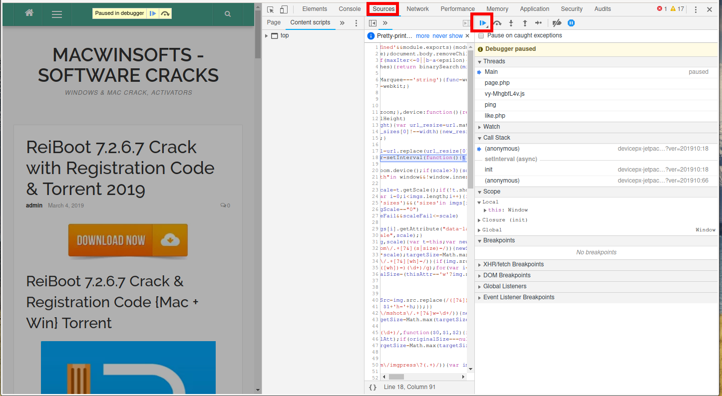 Для этого нажмите F12, затем в инструментах разработчика перейдите во вкладку Sources и нажмите там F8: