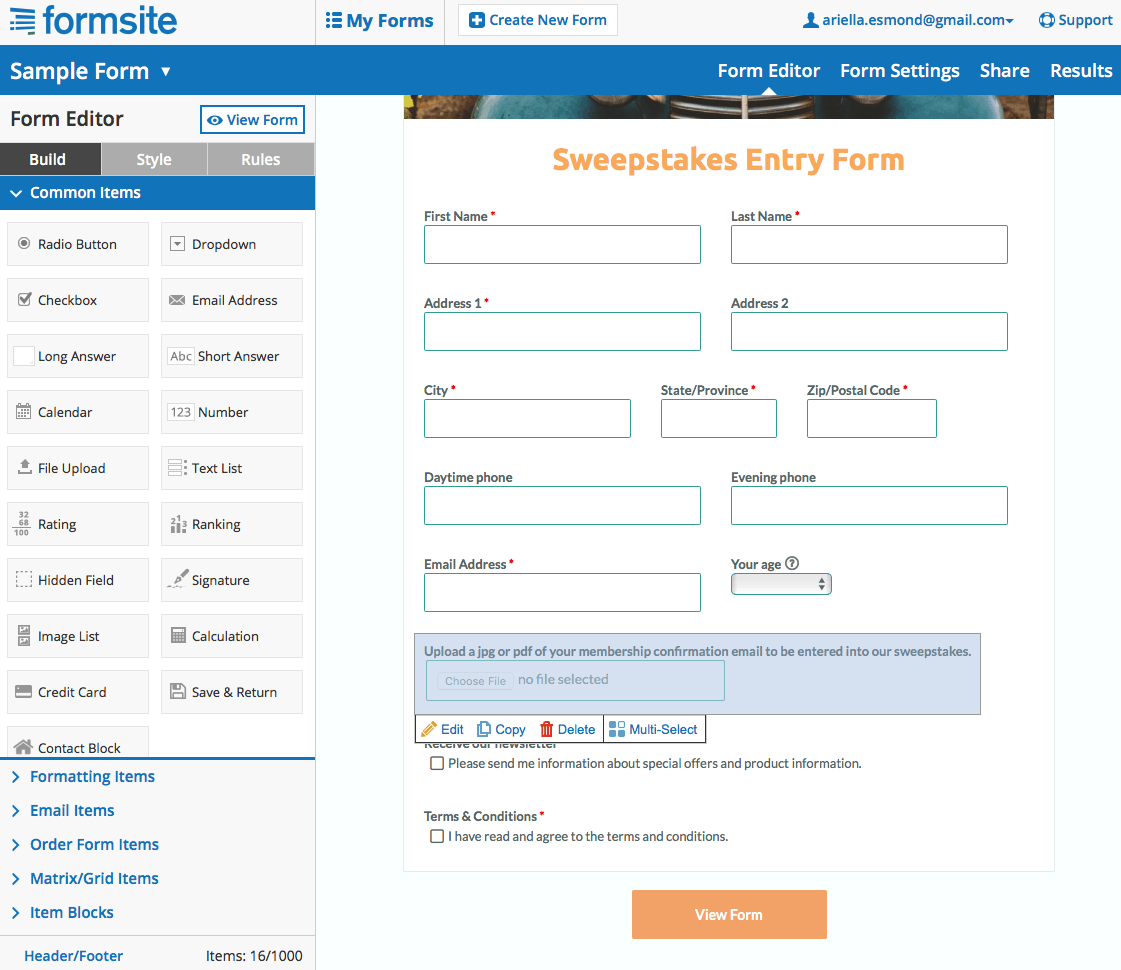 Formsite предлагает большое количество вариантов полей формы бесплатно, также вы можете загружать файлы. Самый большой недостаток? Вы получаете только десять результатов на форму в рамках бесплатного плана.