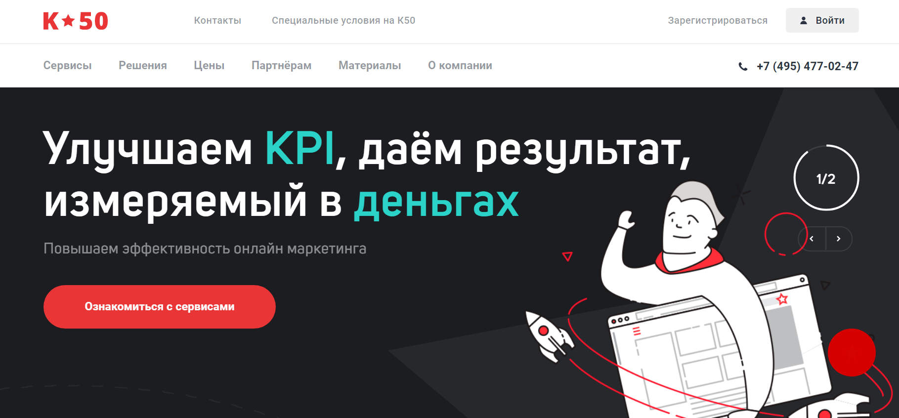 Платформа K50 мотивирует к покупке фразой «Улучшаем KPI, даем результат, измеряемый в деньгах». Эта фраза емко и понятно рассказывает, что получит клиент
