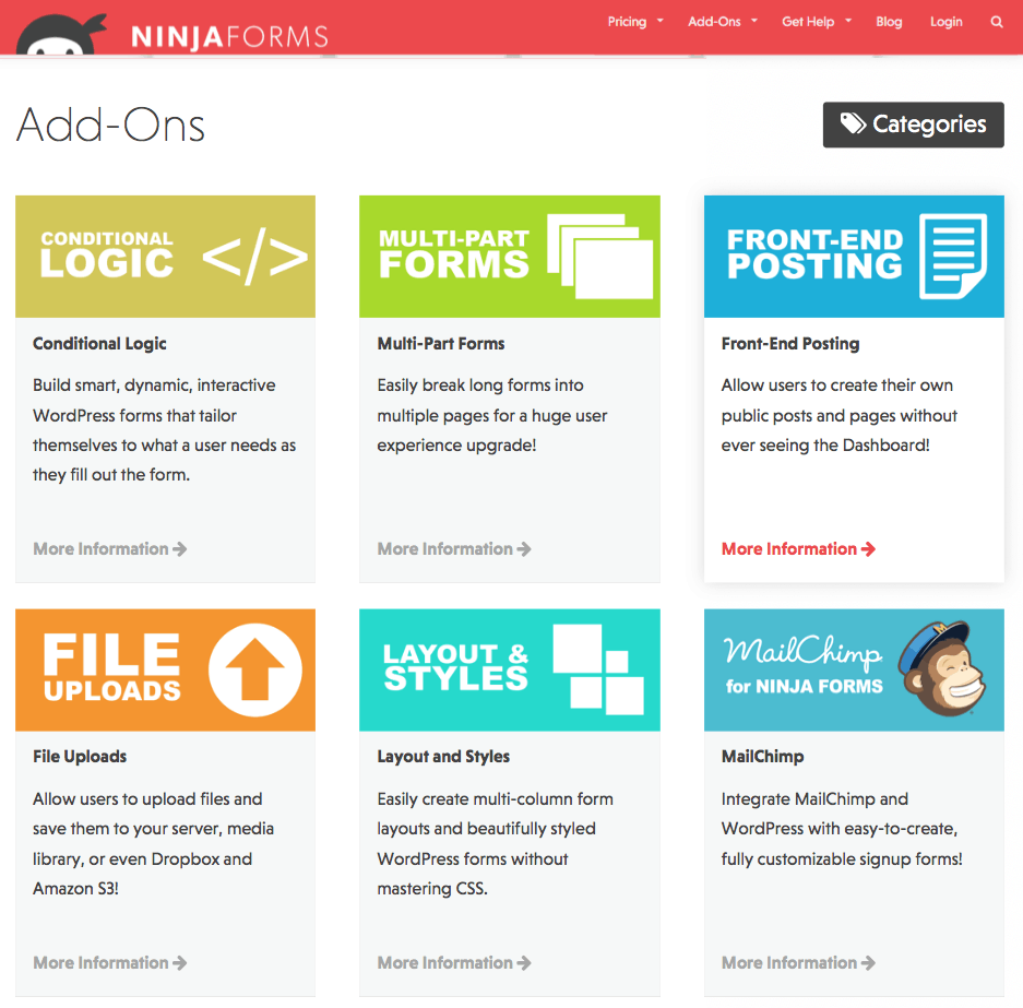 Дополнения. С Ninja Forms вам не нужно подписываться на годовой план. Дополнения можно приобретать индивидуально. Например, если вы подписаны на персональный план и хотите добавить интеграцию Zapier, покупка дополнения обойдется до 60% дешевле, чем обновление до плана следующего уровня.