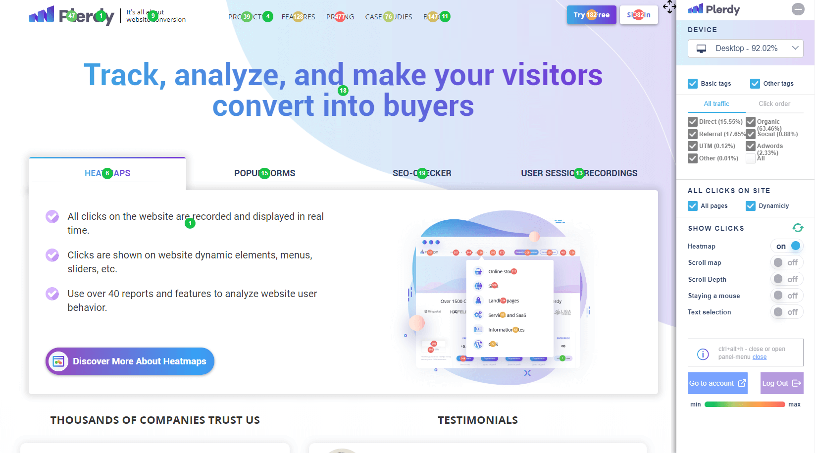 Многофункциональная платформа для увеличения конверсий, улучшения юзабилити и SEO-показателей сайта. Plerdy включает в себя тепловые карты кликов, записи сеансов пользователей на сайте, умные popup-формы и SEO Checker для SEO-анализа сайта. Есть бесплатная версия с ограничениями. Платные тарифы начинаются от $23 в месяц.