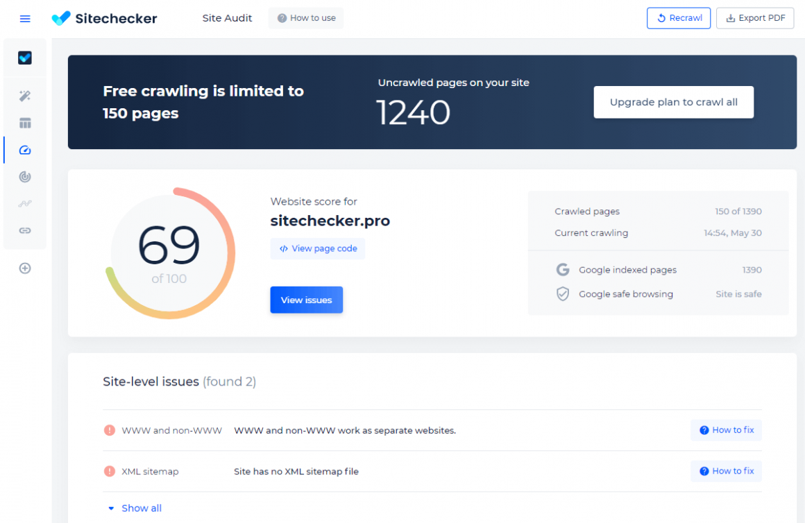 Функционал не так огромен, поэтому для серьезного анализа крупных проектов вряд ли подойдет. Среди инструментов: статистика посещений, анализ переходов и конверсии, Page Rank и Alexa Rank. Есть еще и SEO-инструменты. Бесплатный.