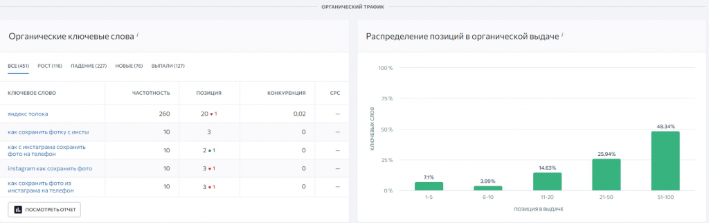 SpyWords — многофункциональный сервис, с помощью которого сравнивают свою семантику и семантику конкурентов. Здесь можно получить данные по конкретным ключам, а также по текстам объявлений для органической выдачи и рекламы. Они будут показываться отдельно для Яндекса и Google.