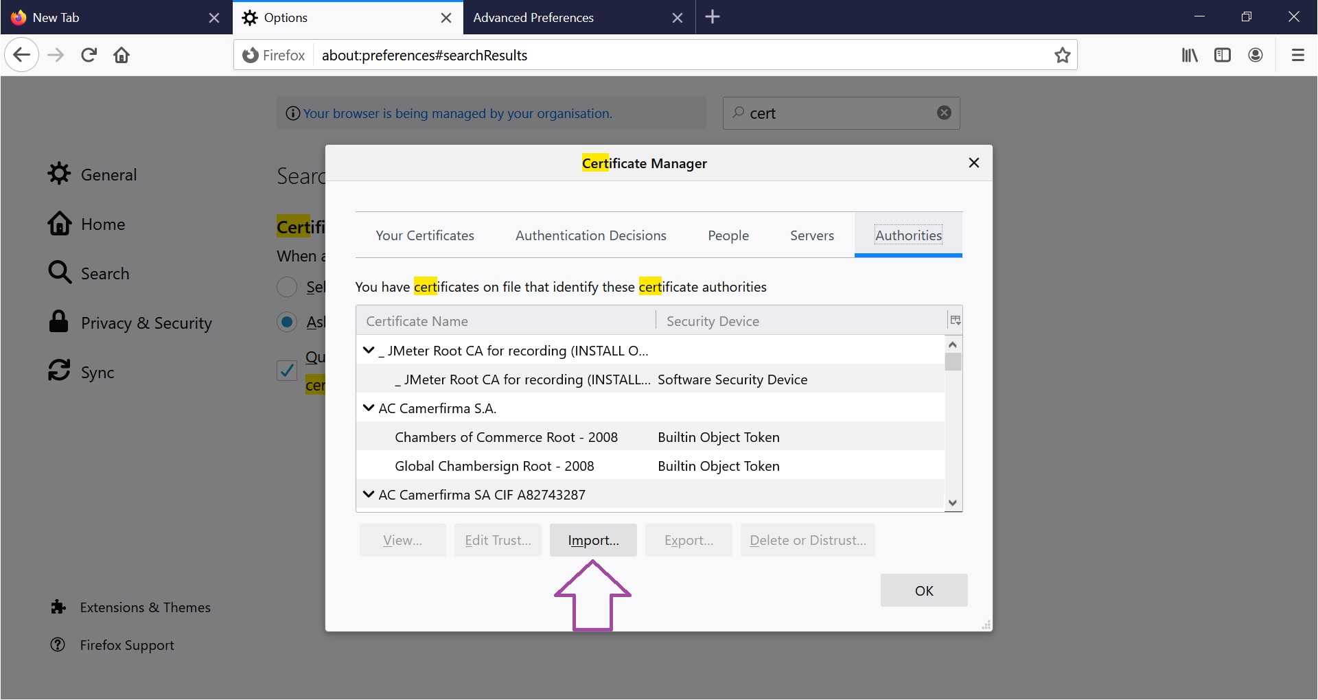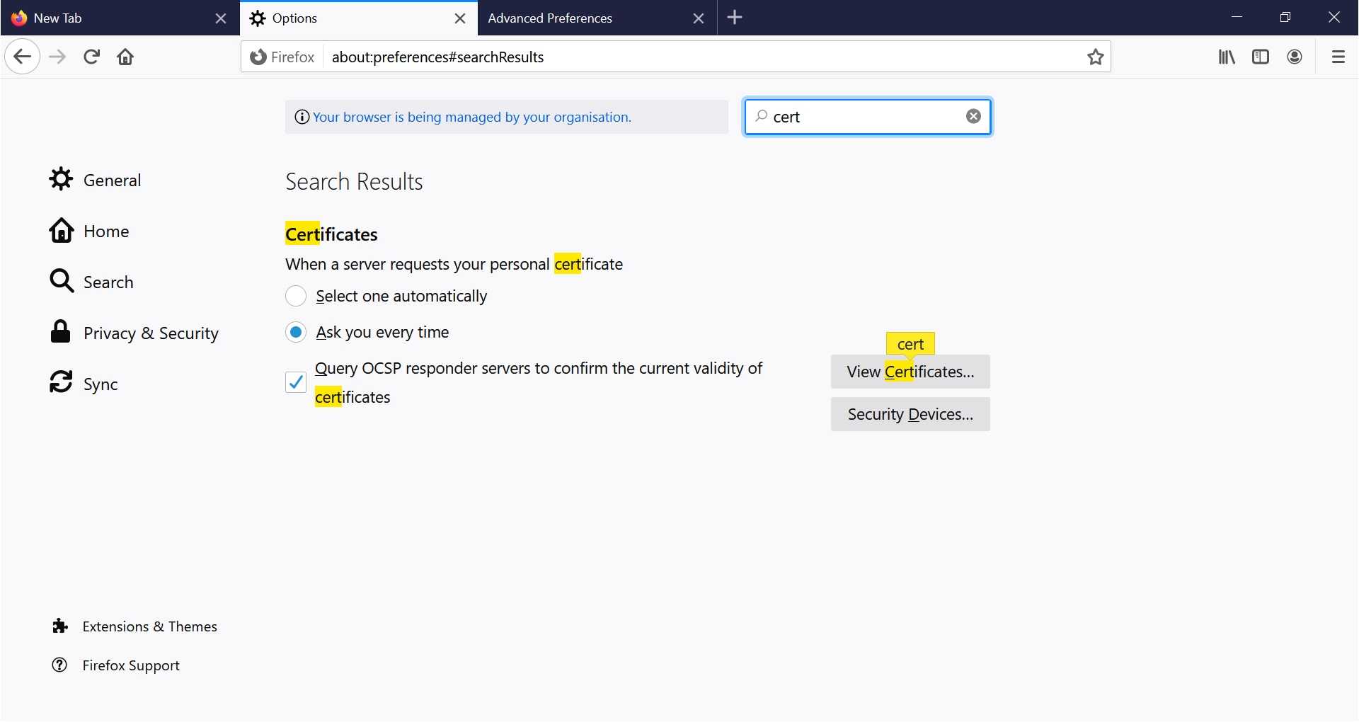 Вернитесь в настройки Firefox. В поиске наберите certificates. Нажмите