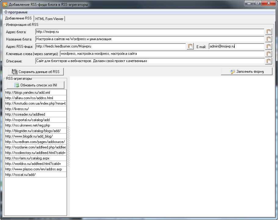 Заполняем несколько полей информацией о нашей ленте/сайте, после чего кликаем ДВАЖДЫ!!!!! по списку RSS-агрегаторов и у нас в большом окне программы загружается сайт. Достаточно нажать кнопку «Заполнить форму», при необходимости выбать категорию сайта в агрегаторе и ввести проверочную капчу.