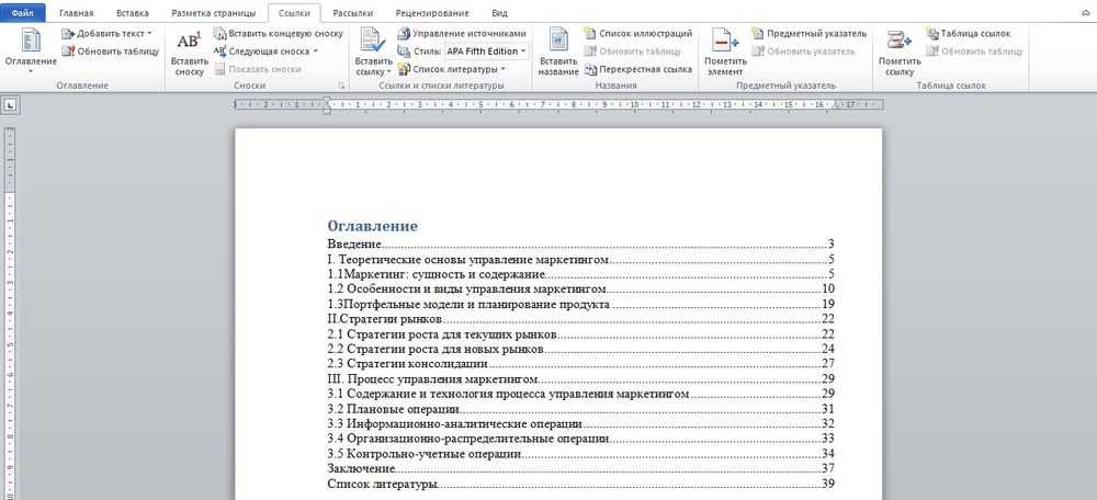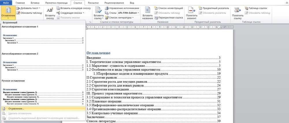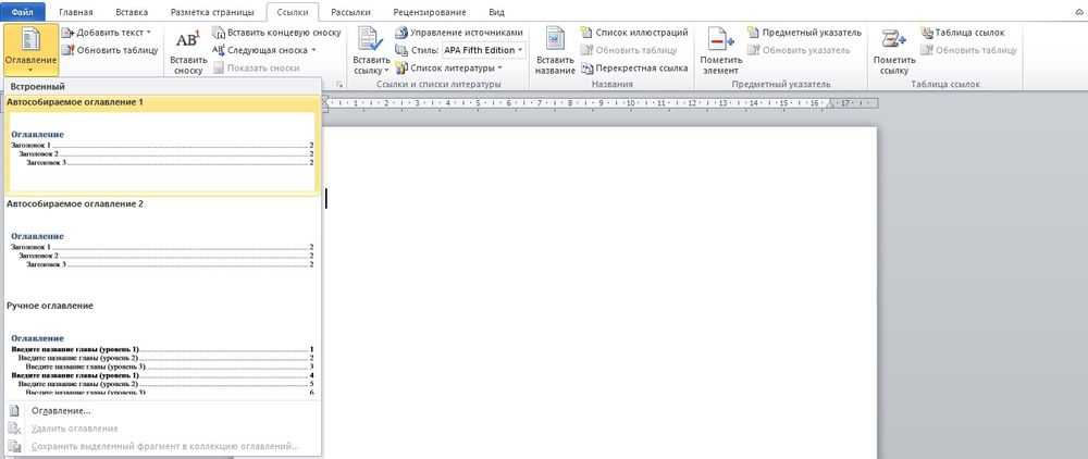 - Во вкладке «Ссылки» нажать на опцию «Оглавление» и выбрать в конце списка одноименный пункт.