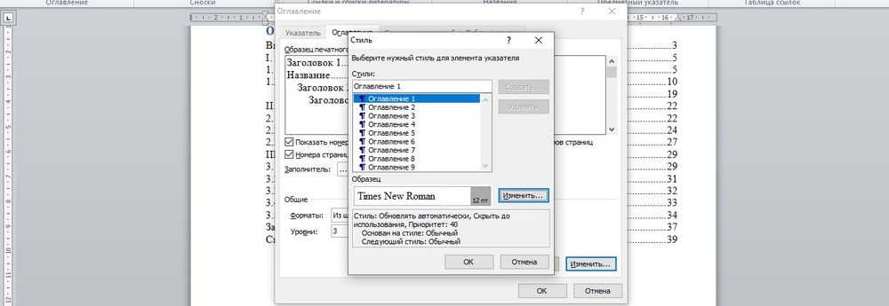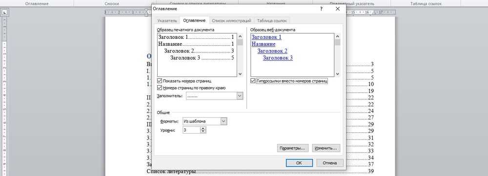 - В открывшемся окне с настройками меняются такие параметры, как заполнитель (точки возле разделов), номера страниц (их скрытие, отображение), уровни.