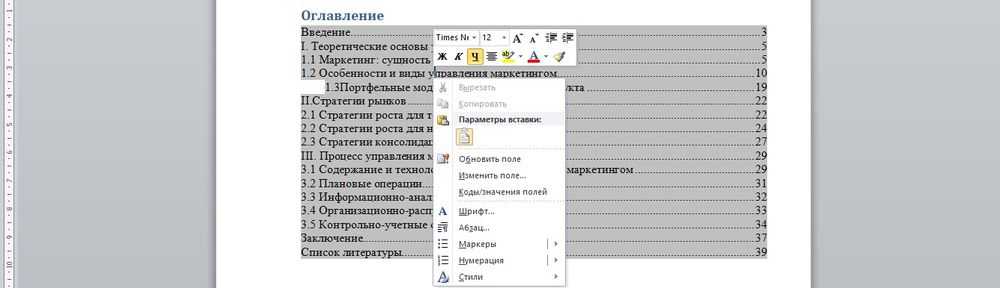 Также обновить разделы и номера страниц возможно, если щелкнуть правой кнопкой мышки по содержанию и выбрать «Обновить поле».