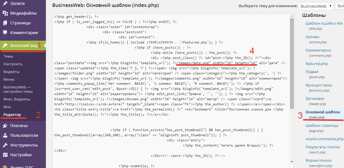 Так вот отрываем административную панель WordPress– «Внешний вид» > «Редактор» — нужный файл. И добавляем параметры ширины и высоты, на основе предложенных размеров в отчёте GTmetrix.