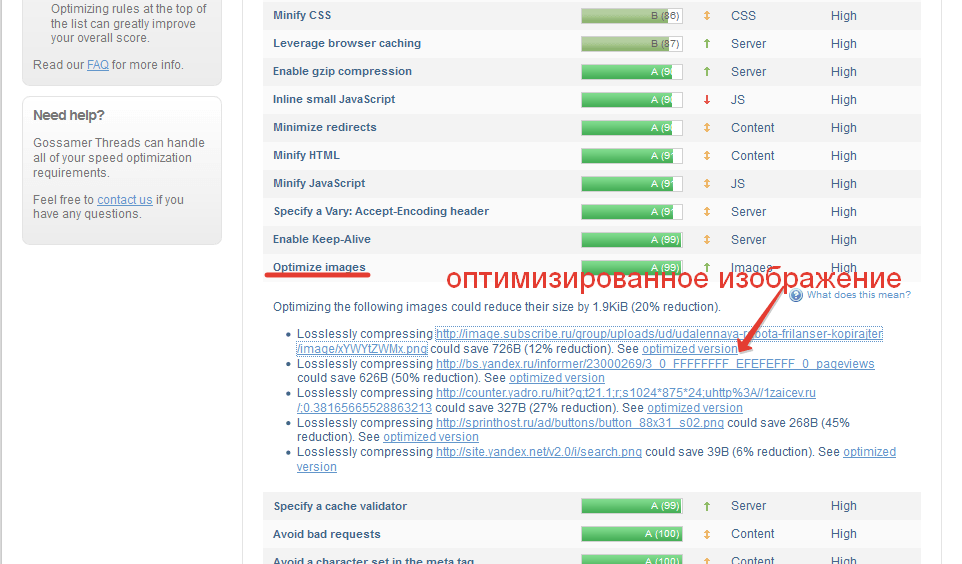 - Оптимизация изображений выполняется с помощью сжатия без потерь.