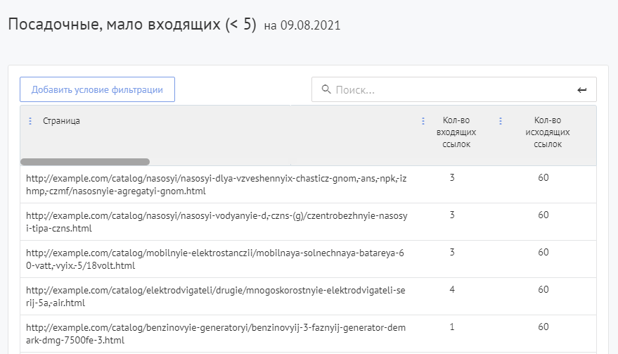 - Отчет «Посадочные, мало входящих» — указывает на посадочные страницы с числом входящих ссылок меньше 5. Этот отчет поможет быстро найти продвигаемые страницы, на которые нужно добавить больше входящих внутренних ссылок: