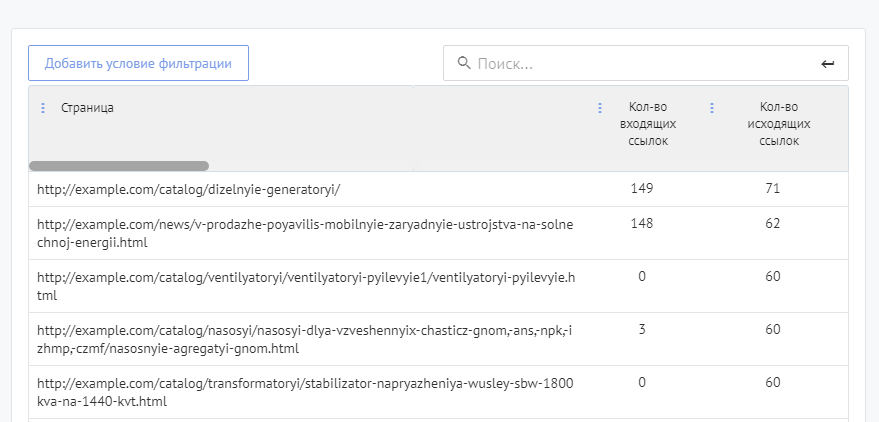 Отчет содержит список всех страниц, на которых есть внутренние ссылки, а также показывает количество входящих и исходящих внутренних ссылок на каждой странице.