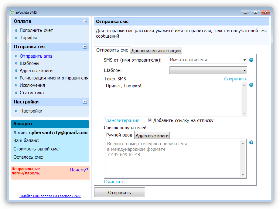 Рассылка производится с помощью специальной программы, которую пользователь сможет скачать после регистрации. Для авторизации используем номер мобильного и электронную почту. Также для массовой рассылки пойдут программы «ePochta SMS» и «SMS-Organizer». Они ориентированы исключительно на массовую рассылку, принцип работы данного ПО был описан в данной статье.